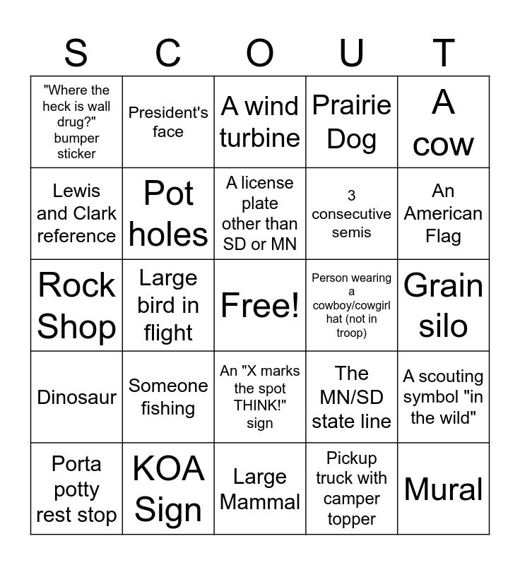 This bingo card has a free space and 31 words: Large Mammal, Small Mammal, Large bird in flight, Small bird on tree, "Where the heck is wall drug?" bumper sticker, A wind turbine, Pot holes, The MN/SD state line, Person wearing a cowboy/cowgirl hat (not in troop), Pickup truck with camper topper, Grain silo, Mural, SD Flag, MN Flag, An American Flag, Something red, A scouting symbol "in the wild", Someone fishing, Dinosaur, An "X marks the spot THINK!" sign, A cow, Yellow vehicle, Porta potty rest stop, President's face, 3 consecutive semis, Lewis and Clark reference, Prairie Dog, Rock Shop, KOA Sign, A license plate other than SD or MN and A Barn.