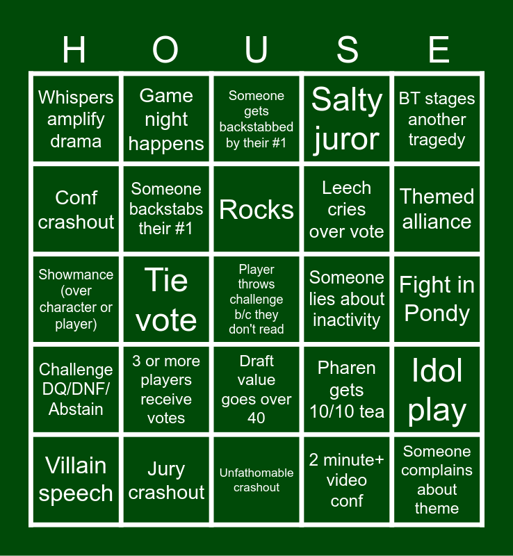 This bingo card has a free space and 24 words: 3 or more players receive votes, Jury crashout, Rocks, Villain speech, BT stages another tragedy, Whispers amplify drama, Conf crashout, Game night happens, Someone lies about inactivity, Draft value goes over 40, Leech cries over vote, Showmance (over character or player), Pharen gets 10/10 tea, Idol play, Someone backstabs their #1, 2 minute+ video conf, Fight in Pondy, Someone gets backstabbed by their #1, Themed alliance, Tie vote, Someone complains about theme, Challenge DQ/DNF/ Abstain, Salty juror and Unfathomable crashout.
