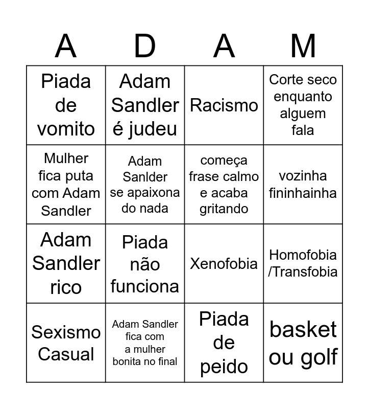 This bingo card has 16 words: Adam Sandler fica com a mulher bonita no final, Homofobia /Transfobia, Racismo, Piada de vomito, Adam Sandler rico, Adam Sandler é judeu, Xenofobia, Piada de peido, Mulher fica puta com Adam Sandler, Adam Sanlder se apaixona do nada, Sexismo Casual, Corte seco enquanto alguem fala, Piada não funciona, vozinha fininhainha, começa frase calmo e acaba gritando and basket ou golf.