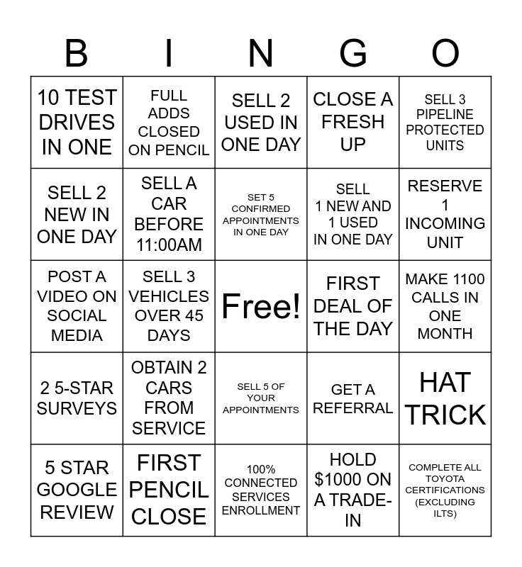 This bingo card has a free space and 24 words: OBTAIN 2 CARS FROM SERVICE, FIRST PENCIL CLOSE, SET 5 CONFIRMED APPOINTMENTS IN ONE DAY, 5 STAR GOOGLE REVIEW, SELL 3 PIPELINE PROTECTED UNITS, 10 TEST DRIVES IN ONE, SELL 2 NEW IN ONE DAY, FULL ADDS CLOSED ON PENCIL, FIRST DEAL OF THE DAY, SELL 5 OF YOUR APPOINTMENTS, SELL 1 NEW AND 1 USED IN ONE DAY, POST A VIDEO ON SOCIAL MEDIA, GET A REFERRAL, HAT TRICK, SELL A CAR BEFORE 11:00AM, HOLD $1000 ON A TRADE-IN, MAKE 1100 CALLS IN ONE MONTH, SELL 2 USED IN ONE DAY, RESERVE 1 INCOMING UNIT, SELL 3 VEHICLES OVER 45 DAYS, COMPLETE ALL TOYOTA CERTIFICATIONS (EXCLUDING ILTS), 2 5-STAR SURVEYS, CLOSE A FRESH UP and 100% CONNECTED SERVICES ENROLLMENT.