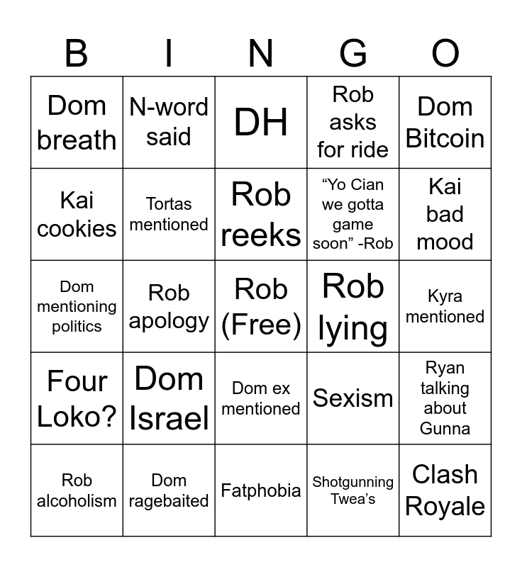 This bingo card has a free space and 24 words: Dom Israel, Dom ragebaited, Rob reeks, Rob alcoholism, Dom Bitcoin, Dom breath, Kai cookies, N-word said, Rob lying, Dom ex mentioned, “Yo Cian we gotta game soon” -Rob, Dom mentioning politics, Sexism, Ryan talking about Gunna, Tortas mentioned, Shotgunning Twea’s, Kyra mentioned, DH, Kai bad mood, Rob apology, Clash Royale, Four Loko?, Rob asks for ride and Fatphobia.
