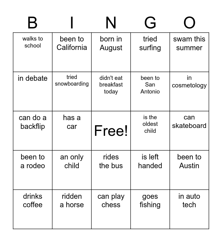This bingo card has a free space and 24 words: an only child, ridden a horse, didn't eat breakfast today, drinks coffee, swam this summer, walks to school, in debate, been to California, is the oldest child, rides the bus, been to San Antonio, can do a backflip, is left handed, been to Austin, tried snowboarding, goes fishing, can skateboard, born in August, in cosmetology, has a car, in auto tech, been to a rodeo, tried surfing and can play chess.