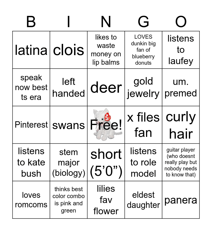 This bingo card has a free space and 24 words: stem major (biology), thinks best color combo is pink and green, deer, loves romcoms, listens to laufey, latina, speak now best ts era, clois, x files fan, short (5’0”), gold jewelry, Pinterest, listens to role model, guitar player (who doesnt really play but nobody needs to know that), left handed, eldest daughter, curly hair, likes to waste money on lip balms, um. premed, swans, panera, listens to kate bush, LOVES dunkin big fan of blueberry donuts and lilies fav flower.