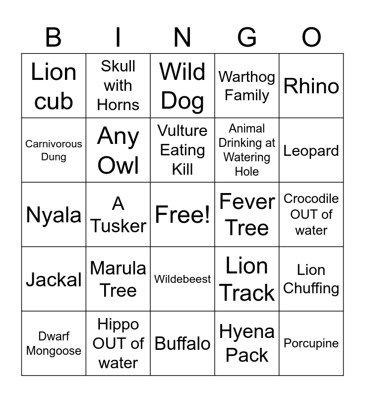 This bingo card has a free space and 44 words: Vervet Monkey, Porcupine, Cheetah, Dwarf Mongoose, Hyena, Hyena Pack, Wild Dog, Zebra, Rhino, Hippo OUT of water, Warthog Family, Fever Tree, Wildebeest, Marula Tree, Duiker, Buffalo, Carcass, Nyala, Kudu, Leopard, Skull with Horns, Lion, Pride of Lions, Lion cub, Crocodile, Crocodile OUT of water, Tortoise, Giant Milipede, Lion Track, Jackal, Bushbuck, Lion Chuffing, Waterbuck, Baby Giraffe, A Tusker, Ostrich, Herd Crossing the Road, Marabou Stork, Vulture Eating Kill, Carnivorous Dung, Animal Drinking at Watering Hole, Kori Bustard, Any Owl and Ground Hornbill.