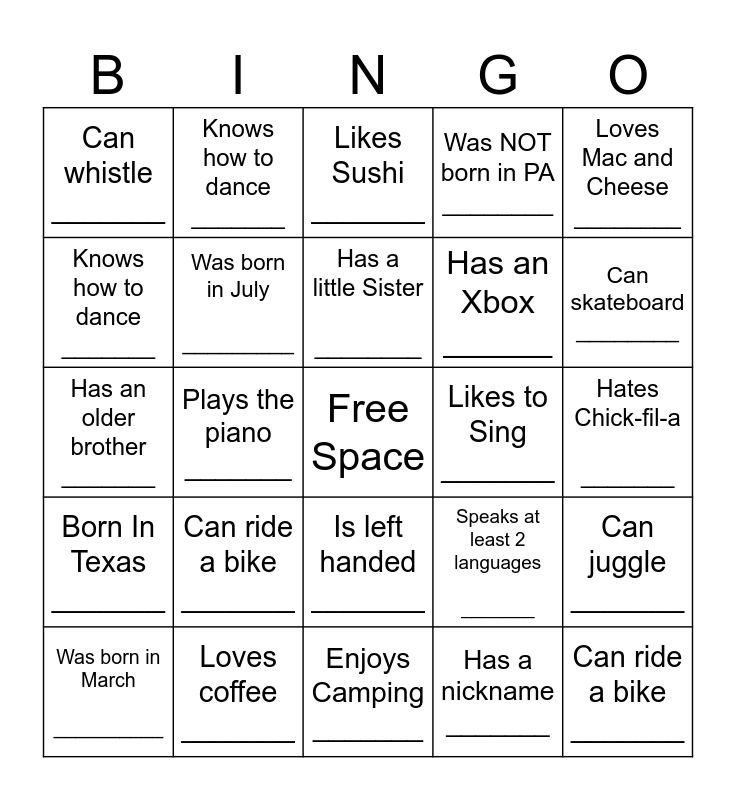 This bingo card has a free space and 32 words: Has a nickname _______, Is wearing mascara ________, Plays the piano _______, Has a Dog _______, Born In Texas _______, Was born in July _________, Loves Mac and Cheese ________, Can juggle _______, Knows how to dance _______, Hates Pizza _______, Has a little Sister ________, Likes Sushi _______, Plays a sport ________, Can whistle _______, Likes to Sing _______, Was NOT born in Texas ________, Was born in March __________, Has an older brother _______, Is left handed _______, Can ride a bike _______, Speaks at least 2 languages _______, Has written a Book _______, Hates Chick-fil-a _______, Loves coffee _______, Can ride a bike _______, Was NOT born in PA ________, Has an Xbox ______, Knows how to dance _______, Can whistle _______, Enjoys Camping _______, Has a nickname _______ and Can skateboard ________.