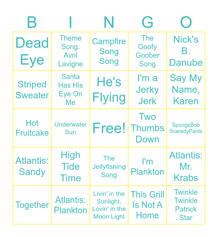 This bingo card has a free space and 75 words: Theme Song, F.U.N. Song, Campfire Song Song, Ripped Pants, Stadium Rave, The Best Day Ever, Idiot Friends, Gary's Song, The Bubble Song, We've Got Scurvy, Don't Be A Jerk (It's Christmas), Sweet Victory, He's Flying, Striped Sweater, Hey All You People, Underwater Sun, When Worlds Collide, Twinkle Twinkle Patrick Star, All You Need Is Friends, Nick's B. Danube, That's What Friends Do, Hot Fruitcake, Santa Has His Eye On Me, Theme Song: Avril Lavigne, The Goofy Goober Song, The Best Day Ever, Ocean Man, Under My Rock, Now That We're Men, Goofy Goober Rock, Ridin' the Hook, Secret To The Formula, Welcome To Bikini Bottom, I'm Plankton, Say My Name, Karen, I'm a Jerky Jerk, Loop de Loop, Texas Song, SpongeBob ScaredyPants, This Grill Is Not A Home, The Very First Christmas, I Wish I Could Fly, Cha-Ching, Down The Well, All About You, I Can't Keep My Eyes Off Of You, Together, Dead Eye, Bee Line for the Tree Line, Oh, My Karen, Oh Krusty Krab, The Jellyfishing Song, Give Jellyfish Fields A Chance, Attitude of Gratitude, Rodeo Song, Squidward's Tiki Land, Musical Doodle, Dear Friend, Road Song, Ghouls O The Briny Deep, High Tide Time, Never Give Up, Thank Gosh It's Monday, Team Work, Rap Battle, Two Thumbs Down, Who Am I?, AHHHH (The Scare Song), My Leg Is In Love, Atlantis: Mr. Krabs, Atlantis: Sandy, Atlantis: Plankton, Atlantis: Squidward, Livin' in the Sunlight, Lovin' in the Moon Light and I Hate People.