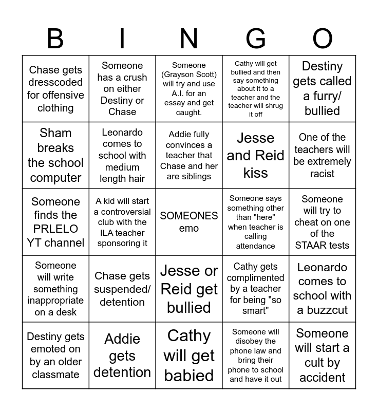 This bingo card has a free space and 24 words: Chase gets suspended/ detention, Addie gets detention, Addie fully convinces a teacher that Chase and her are siblings, Destiny gets emoted on by an older classmate, Destiny gets called a furry/ bullied, Chase gets dresscoded for offensive clothing, Sham breaks the school computer, Someone has a crush on either Destiny or Chase, Someone says something other than "here" when teacher is calling attendance, Jesse or Reid get bullied, Jesse and Reid kiss, Someone finds the PRLELO YT channel, Cathy gets complimented by a teacher for being "so smart", Leonardo comes to school with a buzzcut, Leonardo comes to school with medium length hair, Someone will disobey the phone law and bring their phone to school and have it out, Someone will try to cheat on one of the STAAR tests, Someone (Grayson Scott) will try and use A.I. for an essay and get caught., One of the teachers will be extremely racist, A kid will start a controversial club with the ILA teacher sponsoring it, Someone will start a cult by accident, Someone will write something inappropriate on a desk, Cathy will get bullied and then say something about it to a teacher and the teacher will shrug it off and Cathy will get babied.