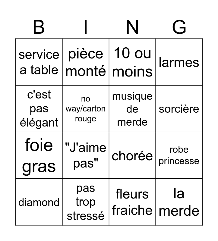 This bingo card has 16 words: pas trop stressé, robe princesse, 10 ou moins, service a table, foie gras, pièce monté, chorée, fleurs fraiche, c'est pas élégant, no way/carton rouge, diamond, larmes, "J'aime pas", sorcière, musique de merde and la merde.