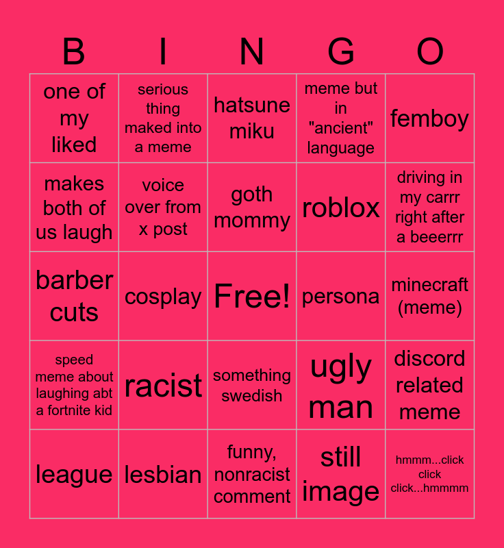 This bingo card has a free space and 24 words: racist, lesbian, goth mommy, league, femboy, one of my liked, makes both of us laugh, serious thing maked into a meme, persona, something swedish, roblox, barber cuts, ugly man, discord related meme, voice over from x post, still image, minecraft (meme), hatsune miku, driving in my carrr right after a beeerrr, cosplay, hmmm...click click click...hmmmm, speed meme about laughing abt a fortnite kid, meme but in "ancient" language and funny, nonracist comment.