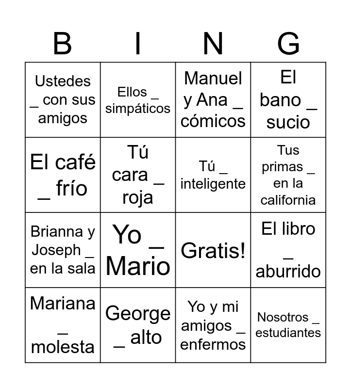 This bingo card has 20 words: El libro _ aburrido, Yo _ triste, Manuel y Ana _ cómicos, Tú _ en la clase, Mariana _ molesta, El café _ frío, George _ alto, Ustedes _ con sus amigos, Brianna y Joseph _ en la sala, Ellos _ simpáticos, Yo _ Mario, Gratis!, Tú cara _ roja, Nosotros _ estudiantes, Tú _ inteligente, Nosotros _ contentos, Tus primas _ en la california, El bano _ sucio, Yo y mi amigos _ enfermos and Mis padres y yo _ chinos.