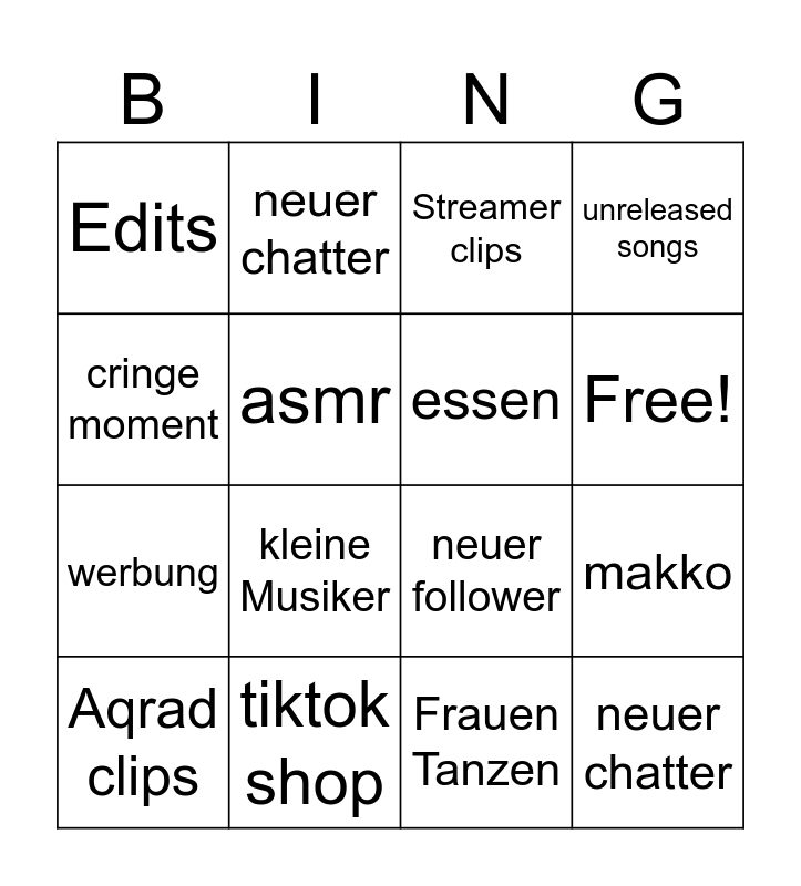 This bingo card has 17 words: Frauen Tanzen, Aqrad clips, Streamer clips, Edits, kleine Musiker, unreleased songs, makko, essen, Free!, asmr, tiktok shop, neuer follower, cringe moment, neuer chatter, werbung, raid and neuer chatter.
