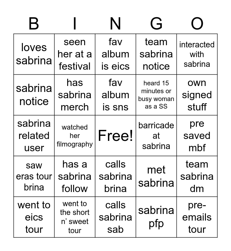 This bingo card has a free space and 24 words: has a sabrina follow, went to the short n’ sweet tour, fav album is sns, went to eics tour, interacted with sabrina, loves sabrina, sabrina notice, seen her at a festival, barricade at sabrina, calls sabrina brina, heard 15 minutes or busy woman as a SS, sabrina related user, met sabrina, team sabrina dm, has sabrina merch, sabrina pfp, pre saved mbf, fav album is eics, own signed stuff, watched her filmography, pre-emails tour, saw eras tour brina, team sabrina notice and calls sabrina sab.
