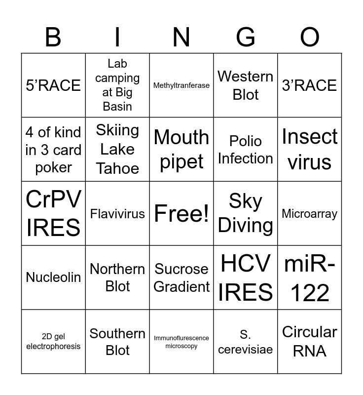 This bingo card has a free space and 24 words: Northern Blot, Southern Blot, Mouth pipet, 2D gel electrophoresis, 3’RACE, 5’RACE, 4 of kind in 3 card poker, Lab camping at Big Basin, Sky Diving, Sucrose Gradient, Polio Infection, CrPV IRES, HCV IRES, miR-122, Skiing Lake Tahoe, S. cerevisiae, Microarray, Methyltranferase, Insect virus, Flavivirus, Circular RNA, Nucleolin, Western Blot and Immunoflurescence microscopy.