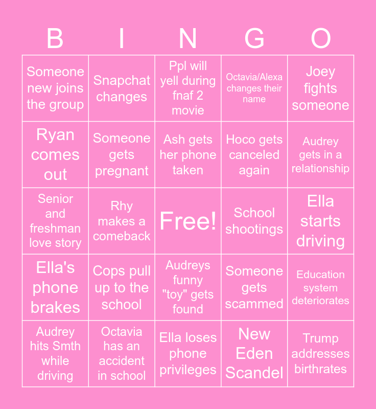 This bingo card has a free space and 24 words: Audrey hits Smth while driving, Cops pull up to the school, Ash gets her phone taken, New Eden Scandel, Joey fights someone, Someone new joins the group, Snapchat changes, Ppl will yell during fnaf 2 movie, School shootings, Ella starts driving, Senior and freshman love story, Someone gets pregnant, Someone gets scammed, Education system deteriorates, Ryan comes out, Octavia has an accident in school, Ella loses phone privileges, Octavia/Alexa changes their name, Audrey gets in a relationship, Ella's phone brakes, Rhy makes a comeback, Audreys funny "toy" gets found, Hoco gets canceled again and Trump addresses birthrates.