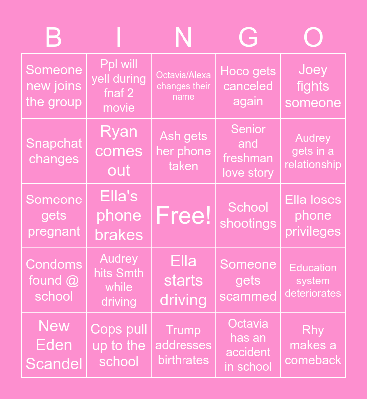 This bingo card has a free space and 24 words: Audrey hits Smth while driving, Cops pull up to the school, Ash gets her phone taken, New Eden Scandel, Joey fights someone, Someone new joins the group, Snapchat changes, Ppl will yell during fnaf 2 movie, School shootings, Ella starts driving, Senior and freshman love story, Someone gets pregnant, Someone gets scammed, Education system deteriorates, Ryan comes out, Octavia has an accident in school, Ella loses phone privileges, Octavia/Alexa changes their name, Audrey gets in a relationship, Ella's phone brakes, Rhy makes a comeback, Condoms found @ school, Hoco gets canceled again and Trump addresses birthrates.
