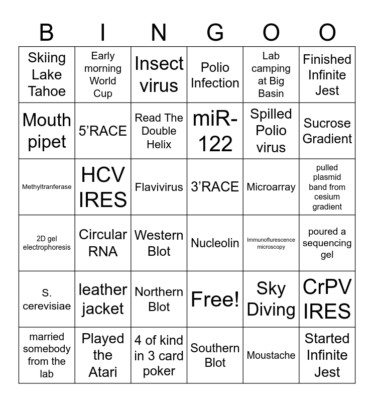 This bingo card has 36 words: Free!, Northern Blot, Southern Blot, Mouth pipet, 2D gel electrophoresis, 3’RACE, 5’RACE, 4 of kind in 3 card poker, Lab camping at Big Basin, Sky Diving, Sucrose Gradient, Polio Infection, CrPV IRES, HCV IRES, miR-122, Skiing Lake Tahoe, S. cerevisiae, Microarray, Methyltranferase, Insect virus, Flavivirus, Circular RNA, Nucleolin, Western Blot, Immunoflurescence microscopy, Early morning World Cup, Spilled Polio virus, Played the Atari, Read The Double Helix, Finished Infinite Jest, Started Infinite Jest, married somebody from the lab, poured a sequencing gel, pulled plasmid band from cesium gradient, leather jacket and Moustache.