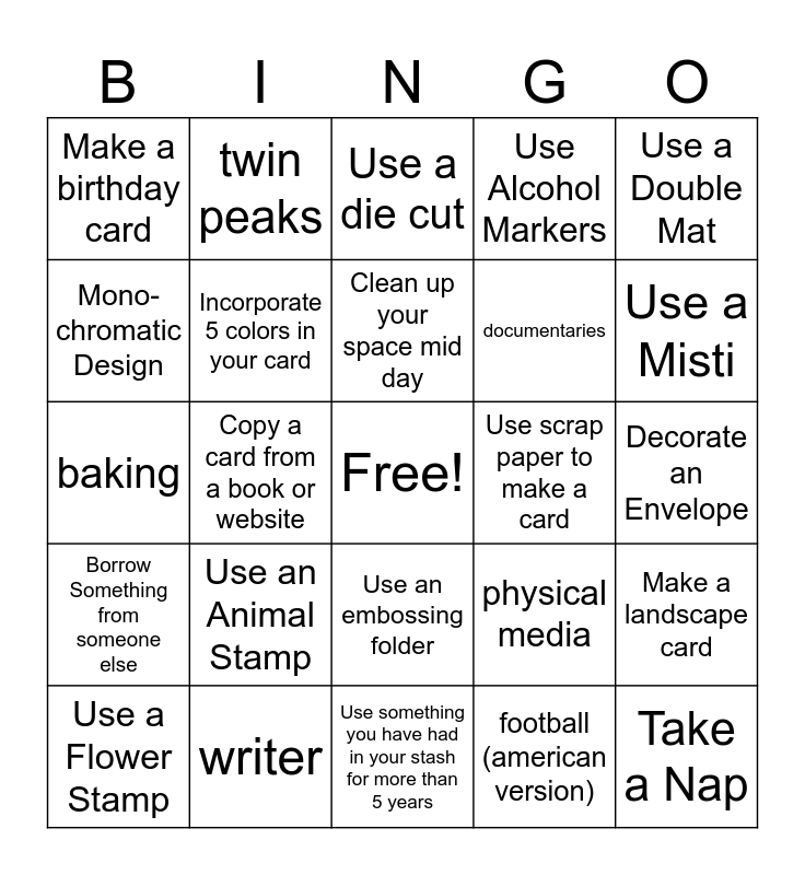 This bingo card has a free space and 37 words: Take a Walk, Make 5 identical cards, Use a new stamp, Incorporate 5 colors in your card, Make a landscape card, Use an Animal Stamp, Clean up your space mid day, Use Colored Pencils, Use a Double Mat, Use 3 stamps on a card, Copy a card from a book or website, Use Alcohol Markers, Take a Nap, Decorate an Envelope, Mono-chromatic Design, Borrow Something from someone else, Pick a Movie, Use a die cut, Use an embossing folder, Use scrap paper to make a card, Make a birthday card, Use a Misti, Use a Flower Stamp, Use something you have had in your stash for more than 5 years, women’s sports, football (american version), twin peaks, the x-files, hiking, hunting/ fishing, cross stitch, writer, baking, cats>dogs, physical media, documentaries and roadtrips.