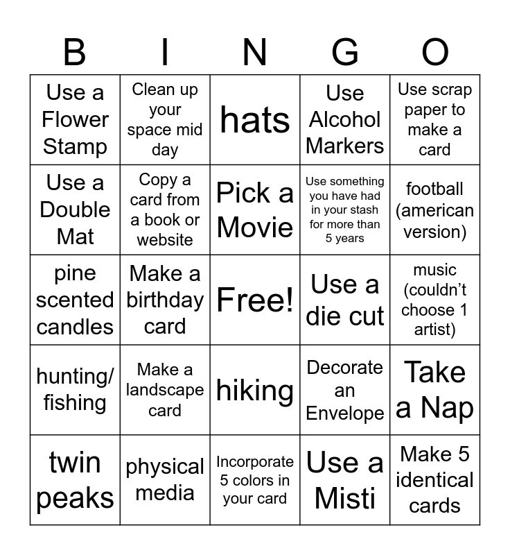 This bingo card has a free space and 49 words: Take a Walk, Make 5 identical cards, Use a new stamp, Incorporate 5 colors in your card, Make a landscape card, Use an Animal Stamp, Clean up your space mid day, Use Colored Pencils, Use a Double Mat, Use 3 stamps on a card, Copy a card from a book or website, Use Alcohol Markers, Take a Nap, Decorate an Envelope, Mono-chromatic Design, Borrow Something from someone else, Pick a Movie, Use a die cut, Use an embossing folder, Use scrap paper to make a card, Make a birthday card, Use a Misti, Use a Flower Stamp, Use something you have had in your stash for more than 5 years, women’s sports, football (american version), twin peaks, the x-files, hiking, hunting/ fishing, cross stitch, writer, baking, cats>dogs, physical media, documentaries, free!, halloween, music (couldn’t choose 1 artist), monty python and the holy grail, crocs, smokey mountains, batman: arkham series, scooby-doo, pine scented candles, hats, glasses, wildlife conservation and roadtrips.