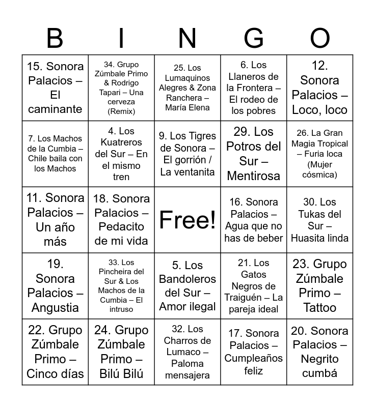 This bingo card has a free space and 35 words: 1.Reina Isabel – No volveré, 2. Los Charros de Lumaco – Somos los Charros, 3. Banda Tropikal de Vallenar – Morena de mis amores, 4. Los Kuatreros del Sur – En el mismo tren, 5. Los Bandoleros del Sur – Amor ilegal, 6. Los Llaneros de la Frontera – El rodeo de los pobres, 7. Los Machos de la Cumbia – Chile baila con los Machos, 8. Los Amigos de Loica – Los laureles, 9. Los Tigres de Sonora – El gorrión / La ventanita, 10. Los Prisioneros del Sur – El celular, 11. Sonora Palacios – Un año más, 12. Sonora Palacios – Loco, loco, 13. Sonora Palacios – El galeón español, 14. Sonora Palacios – Los domingos (La peineta), 15. Sonora Palacios – El caminante, 16. Sonora Palacios – Agua que no has de beber, 17. Sonora Palacios – Cumpleaños feliz, 18. Sonora Palacios – Pedacito de mi vida, 19. Sonora Palacios – Angustia, 20. Sonora Palacios – Negrito cumbá, 21. Los Gatos Negros de Traiguén – La pareja ideal, 22. Grupo Zúmbale Primo – Cinco días, 23. Grupo Zúmbale Primo – Tattoo, 24. Grupo Zúmbale Primo – Bilú Bilú, 25. Los Lumaquinos Alegres & Zona Ranchera – María Elena, 26. La Gran Magia Tropical – Furia loca (Mujer cósmica), 27. Amor Sureño – Ay mi amor, 28. SantaFeria & Zúmbale Primo – Qué te vaya bien, 29. Los Potros del Sur – Mentirosa, 30. Los Tukas del Sur – Huasita linda, 31. Los Charros de Lumaco – Charros para rato, 32. Los Charros de Lumaco – Paloma mensajera, 33. Los Pincheira del Sur & Los Machos de la Cumbia – El intruso, 34. Grupo Zúmbale Primo & Rodrigo Tapari – Una cerveza (Remix) and 35. Los Charros de Luchito y Rafael – Amor.