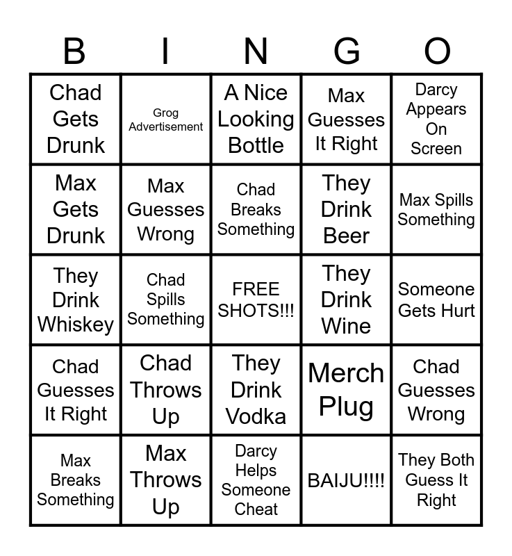 This bingo card has a free space and 24 words: Chad Throws Up, Max Throws Up, Chad Breaks Something, Max Breaks Something, Darcy Appears On Screen, Chad Gets Drunk, Max Gets Drunk, Grog Advertisement, They Drink Wine, They Drink Vodka, They Drink Beer, They Drink Whiskey, Merch Plug, Chad Guesses Wrong, Max Guesses Wrong, BAIJU!!!!, Someone Gets Hurt, A Nice Looking Bottle, Max Spills Something, Chad Spills Something, They Both Guess It Right, Chad Guesses It Right, Max Guesses It Right and Darcy Helps Someone Cheat.