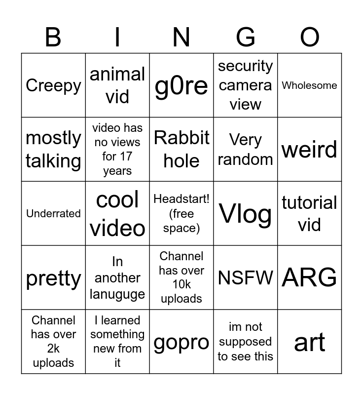 This bingo card has a free space and 24 words: In another lanuguge, I learned something new from it, Rabbit hole, Channel has over 2k uploads, Wholesome, Creepy, mostly talking, animal vid, Vlog, Channel has over 10k uploads, Very random, Underrated, NSFW, ARG, video has no views for 17 years, im not supposed to see this, tutorial vid, g0re, weird, cool video, art, pretty, security camera view and gopro.