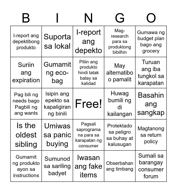 This bingo card has a free space and 24 words: Umiwas sa panic buying, Sumunod sa sariling badyet, Piliin ang produkto hindi tatak batay sa kalidad, Gumamit ng produkto ayon sa instructions, Gumawa ng budget plan bago ang grocery, I-report ang depektibong produkto, Suriin ang expiration, Suporta sa lokal, Huwag bumili ng di kailangan, Pagsali saprograma na para sa karapatan ng consumer, May alternatibo o pamalit, Pag bili ng needs bago Pagbili ng ang wants, Protektado sa peligro sa buhay at kalusugan, Magtanong sa return policy, Gumamit ng eco-bag, Obserbahan ang timbang, Basahin ang sangkap, I-report ang depekto, Turuan ang iba tungkol sa karapatan, Isipin ang epekto sa kapaligiran ng binili, Sumali sa barangay consumer forum, Is the oldest sibling, Mag-research para sa produktong bibilhin and Iwasan ang fake items.