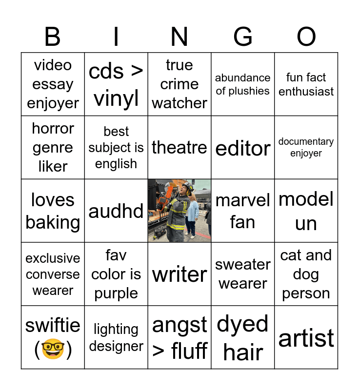 This bingo card has a free space and 24 words: fav color is purple, lighting designer, theatre, swiftie (🤓), fun fact enthusiast, video essay enjoyer, horror genre liker, cds > vinyl, marvel fan, writer, editor, loves baking, sweater wearer, cat and dog person, best subject is english, dyed hair, model un, true crime watcher, documentary enjoyer, audhd, artist, exclusive converse wearer, abundance of plushies and angst > fluff.