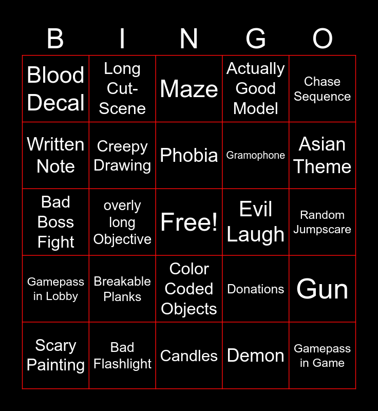 This bingo card has a free space and 24 words: Breakable Planks, Bad Flashlight, Phobia, Scary Painting, Chase Sequence, Blood Decal, Written Note, Long Cut-Scene, Evil Laugh, Color Coded Objects, Gramophone, Bad Boss Fight, Donations, Gun, Creepy Drawing, Demon, Random Jumpscare, Maze, Asian Theme, overly long Objective, Gamepass in Game, Gamepass in Lobby, Actually Good Model and Candles.