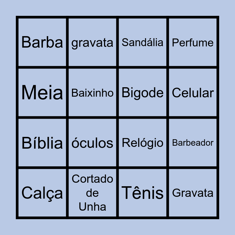 This bingo card has 41 words: Barba, Relógio, Bíblia, Bigode, Camiseta, Sapato, Celular, Cinto, Meia, Gravata, Barbeador, Perfume, Calça, Tênis, Cortado de Unha, Barrigudo, Relógio, Barba, Chapéu, Sandália, Careca, Bigode, Cabelo, Bíblia, calça, cinto, tênis, escova de dente, óculos, perfume, carteira, gravata, Celular, Camiseta, Alto, Baixinho, cortador de unha, ferramentas, barbeador, sabonete and barrigudo.