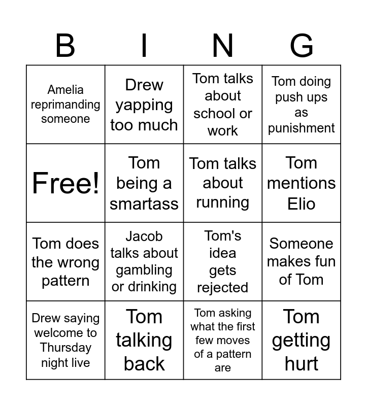 This bingo card has 16 words: Tom talking back, Someone makes fun of Tom, Tom talks about school or work, Amelia reprimanding someone, Tom does the wrong pattern, Drew yapping too much, Tom's idea gets rejected, Tom asking what the first few moves of a pattern are, Free!, Tom being a smartass, Drew saying welcome to Thursday night live, Tom doing push ups as punishment, Jacob talks about gambling or drinking, Tom mentions Elio, Tom talks about running and Tom getting hurt.