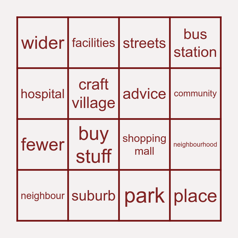 This bingo card has 16 words: suburb, neighbourhood, streets, wider, fewer, facilities, shopping mall, park, hospital, craft village, neighbour, bus station, buy stuff, community, advice and place.