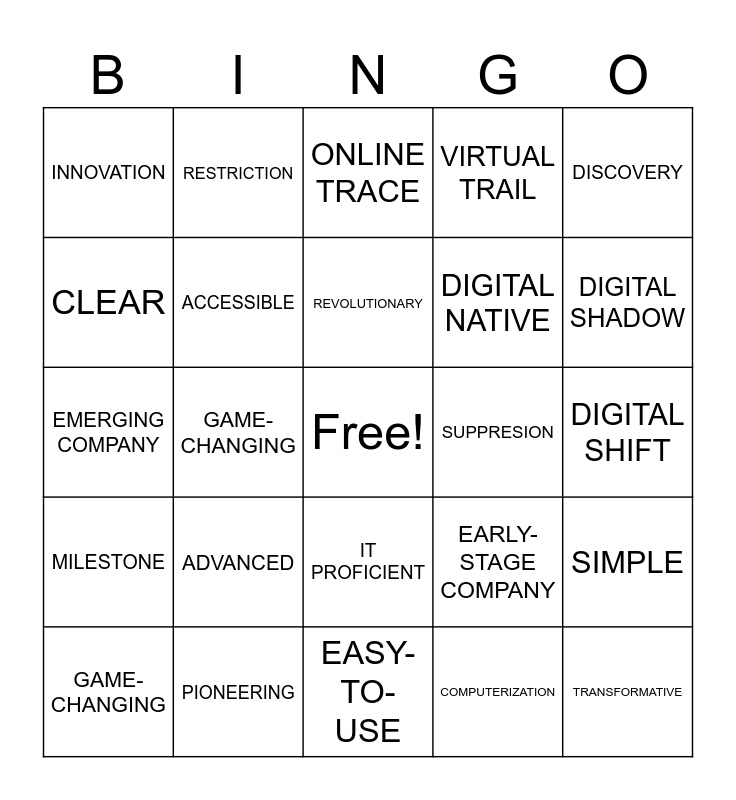 This bingo card has a free space and 24 words: ADVANCED, PIONEERING, REVOLUTIONARY, GAME-CHANGING, DISCOVERY, INNOVATION, CLEAR, RESTRICTION, SUPPRESION, IT PROFICIENT, DIGITAL NATIVE, EMERGING COMPANY, EARLY-STAGE COMPANY, SIMPLE, ACCESSIBLE, COMPUTERIZATION, DIGITAL SHIFT, ONLINE TRACE, DIGITAL SHADOW, GAME-CHANGING, TRANSFORMATIVE, MILESTONE, VIRTUAL TRAIL and EASY-TO-USE.