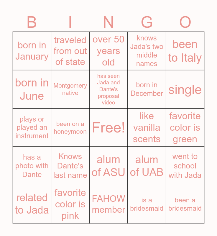 This bingo card has a free space and 47 words: has a Master's degree, been a bridesmaid, a Boomer, FAHOW member, Knows Dante's last name, has traveled with Jada, traveled from out of state, knows how Jada and Dante met, born in June, married in December, Montgomery native, knows Jada's two middle names, went to school with Jada, alum of UAB, has a photo with Jada, has met Dante, has seen Jada and Dante's proposal video, like vanilla scents, a fan of Jazz music, been to Italy, been on a honeymoon, is a bridesmaid, born in January, born in December, married over 5 years, single, related to Jada, went to school with Dante, alum of ASU, has a photo with Dante, doesn't like coffee, a fan of Christian rap, has a passport, been to England, has eloped, favorite color is pink, favorite color is green, brought a gift, brought a card, brought a dish, under 30 years old, over 50 years old, plays or played an instrument, watched Jada grow up, watched Dante grow up, grew up with Jada and grew up with Dante.