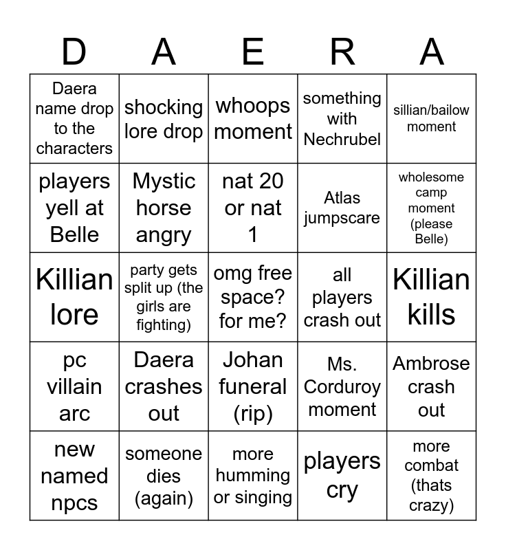 This bingo card has a free space and 24 words: Daera crashes out, someone dies (again), nat 20 or nat 1, new named npcs, sillian/bailow moment, Daera name drop to the characters, players yell at Belle, shocking lore drop, all players crash out, Johan funeral (rip), Atlas jumpscare, Killian lore, Ms. Corduroy moment, Ambrose crash out, Mystic horse angry, players cry, Killian kills, whoops moment, wholesome camp moment (please Belle), party gets split up (the girls are fighting), more combat (thats crazy), pc villain arc, something with Nechrubel and more humming or singing.