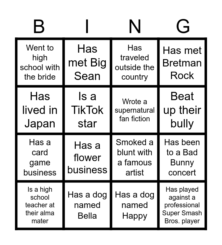 This bingo card has 30 words: Free!, Has an elephant tattoo, Has been to a Bad Bunny concert, Their BTS bias is J-Hope, Went to high school with the bride, Has traveled outside the country, Wrote a supernatural fan fiction, Watched 50 Shades of Grey with their mom, Has a dog named Bella, Was part of a pipefitters union, Has a dog named Happy, Is a high school teacher at their alma mater, Got punched in the face by their brother, Has a bear paw tattoo, Has a flower business, Find both a speech pathologist, Has been to a Jonas Brothers concert, Has played against a professional Super Smash Bros. player, Has a septum piercing, Has lived in Japan, Smoked a blunt with a famous artist, Is a writer for the Fullerton newspaper, Has met Big Sean, Has a card game business, Is a TikTok star, Has met Bretman Rock, Their best friend is an ABC News reporter, Has been to Puerto Rico, Beat up their bully and Has been to North Korea.