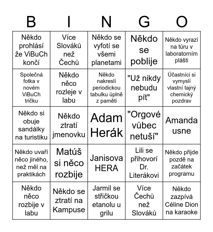 This bingo card has a free space and 24 words: Matúš si něco rozbije, Někdo se ztratí na Kampuse, Někdo nakreslí periodickou tabulku úplně z paměti, Někdo něco rozbije v labu, Někdo vyrazí na túru v laboratorním plášti, Někdo prohlásí že ViBuCh končí, Společná fotka v novém ViBuCh tričku, Více Slováků než Čechů, "Orgové vůbec netuší", Janisova HERA, "Už nikdy nebudu pít", Někdo si obuje sandálky na turistiku, Lili se přihovorí Dr. Literákovi, Někdo přijde pozdě na začátek programu, Někdo něco rozleje v labu, Více Čechů než Slováků, Amanda usne, Někdo se vyfotí se všemi planetami, Účastníci si vymyslí vlastní tajný chemický pozdrav, Někdo ztratí jmenovku, Někdo zazpívá Céline Dion na karaoke, Někdo uvaří něco jiného, než měl na praktikách, Někdo se poblije and Jarmil se střičkou etanolu u grilu.