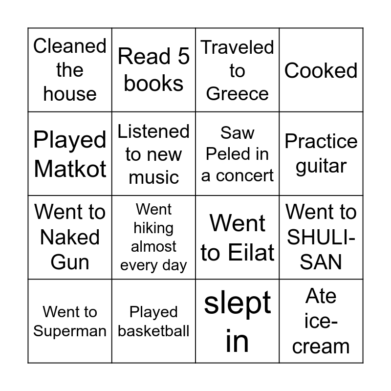 This bingo card has 16 words: Played basketball, Went to SHULI-SAN, Traveled to Greece, Cleaned the house, Went to Naked Gun, Read 5 books, Went to Eilat, slept in, Played Matkot, Listened to new music, Went to Superman, Cooked, Went hiking almost every day, Practice guitar, Saw Peled in a concert and Ate ice-cream.