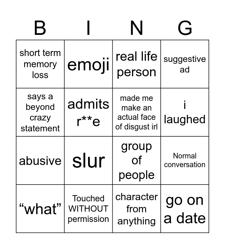 This bingo card has 16 words: Touched WITHOUT permission, Normal conversation, real life person, short term memory loss, abusive, emoji, group of people, character from anything, says a beyond crazy statement, admits r**e, “what”, suggestive ad, slur, i laughed, made me make an actual face of disgust irl and go on a date.