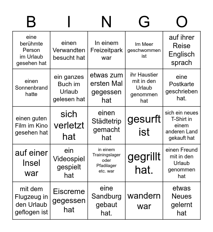 This bingo card has 25 words: ein Videospiel gespielt hat, eine Sandburg gebaut hat., etwas zum ersten Mal gegessen hat, mit dem Flugzeug in den Urlaub geflogen ist, auf ihrer Reise Englisch sprach, eine berühmte Person im Urlaub gesehen hat, einen Sonnenbrand hatte, einen Verwandten besucht hat, gesurft ist, in einem Trainingslager oder Pfadilager etc. war, ihr Haustier mit in den Urlaub genommen hat, einen guten Film im Kino gesehen hat, gegrillt hat., einen Freund mit in den Urlaub genommen hat, ein ganzes Buch im Urlaub gelesen hat, etwas Neues gelernt hat, sich ein neues T-Shirt in einem anderen Land gekauft hat, In einem Freizeitpark war, eine Postkarte geschrieben hat., sich verletzt hat, einen Städtetrip gemacht hat, Eiscreme gegessen hat, auf einer Insel war, Im Meer geschwommen ist and wandern war.