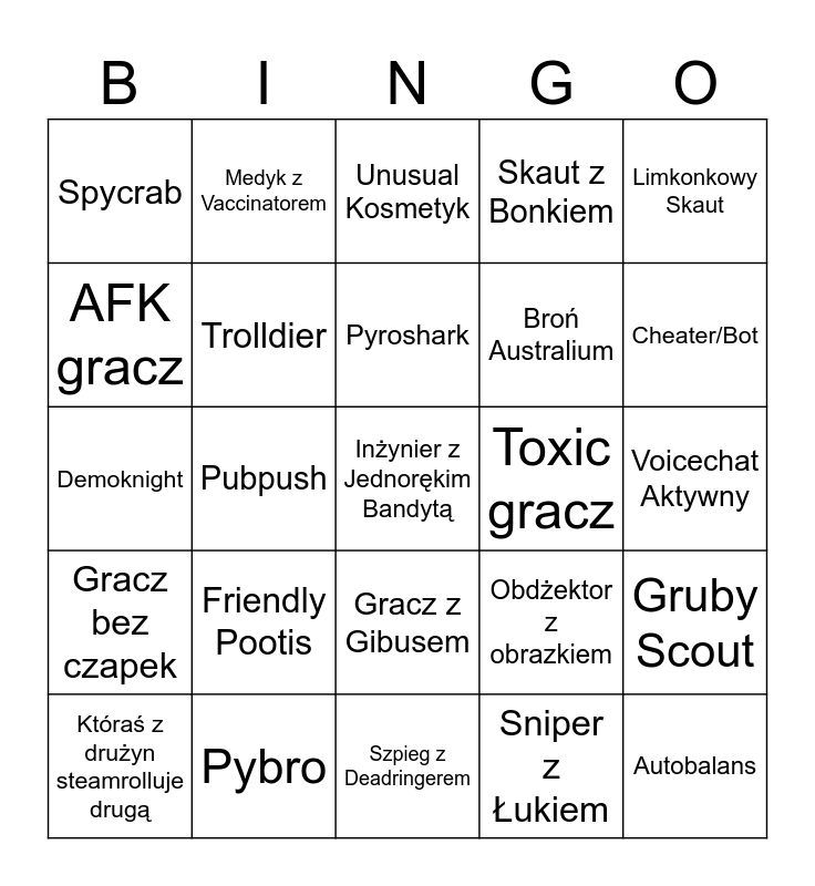 This bingo card has 25 words: Friendly Pootis, Szpieg z Deadringerem, Pyroshark, Któraś z drużyn steamrolluje drugą, Limkonkowy Skaut, Spycrab, AFK gracz, Medyk z Vaccinatorem, Toxic gracz, Gracz z Gibusem, Broń Australium, Demoknight, Obdżektor z obrazkiem, Gruby Scout, Trolldier, Autobalans, Voicechat Aktywny, Unusual Kosmetyk, Cheater/Bot, Pubpush, Inżynier z Jednorękim Bandytą, Pybro, Gracz bez czapek, Skaut z Bonkiem and Sniper z Łukiem.