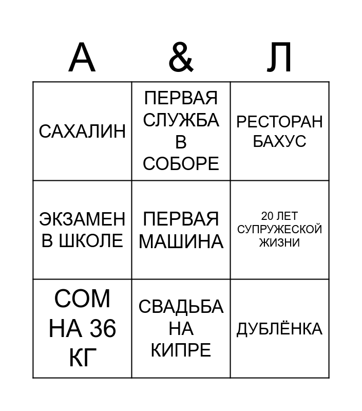 This bingo card has 12 words: БИРЮЗОВАЯ СВАДЬБА, ДУБЛЁНКА, ПЕРВАЯ МАШИНА, 20 ЛЕТ СУПРУЖЕСКОЙ ЖИЗНИ, ПЕРВАЯ СЛУЖБА В СОБОРЕ, РЕСТОРАН БАХУС, СВАДЬБА НА КИПРЕ, СЛУЧАЙНАЯ ПОКУПКА КВАРТИРЫ, САХАЛИН, ЭКЗАМЕН В ШКОЛЕ, СОМ НА 36 КГ and НОВЫЙ ГОД В РУССКОМ СТИЛЕ.
