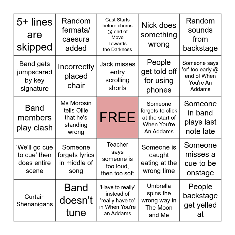 This bingo card has a free space and 31 words: 'Have to really' instead of 'really have to' in When You're an Addams, A teacher corrects someone, then realises that they are incorrect, Ms Morosin tells Ollie that he's standing wrong, Lighting Shenanigans, 5+ lines are skipped, Cast Starts before chorus @ end of Move Towards the Darkness, Incorrectly placed chair, Someone is caught eating at the wrong time, Someone forgets to click at the start of When You're An Addams, Umbrella spins the wrong way in The Moon and Me, Someone in band plays last note late, People backstage get yelled at, Ms Propsting conducts too slow or too fast, Microphone Shenanigans, Someone says 'or' too early @ end of When You're An Addams, Lost Props, Someone misses a cue to be onstage, Someone forgets lyrics in middle of song, 'We'll go cue to cue' then does entire scene, Teacher says someone is too loud, then too soft, Random sounds from backstage, Hugo receives yet another part, Curtain Shenanigans, Random fermata/ caesura added, People get told off for using phones, Band gets jumpscared by key signature, Nick does something wrong, Band members play clash, Band doesn't tune, Jack misses entry scrolling shorts and Jack gets yelled at.