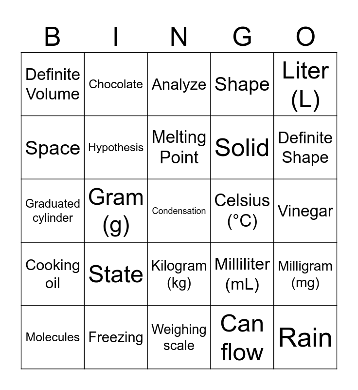This bingo card has a free space and 95 words: Matter, Melting, Can flow, Liquid, Take shape of their container, Gas, No definite volume, Freezing, Can be compressed, Definite mass, Boiling Point, Evaporation, Diffusion, Melting Point, Solid, Definite Volume, Definite Shape, No Definite Shape, Cannot flow, Cannot be compressed, Matter, Mass, Weight, Volume, Shape, Space, Property, Solid, Liquid, Gas, State, Material, Texture, Color, Molecules, Measurement, Weighing scale, Triple beam balance, Graduated cylinder, Thermometer, Milligram (mg), Gram (g), Kilogram (kg), Liter (L), Milliliter (mL), Celsius (°C), Estimate, Unit, Tool, Meniscus, Heat, Temperature, Melting, Freezing, Boiling, Condensation, Evaporation, Heating, Cooling, Change, Hypothesis, Observation, Experiment, Data, Conclusion, Problem, Test, Record, Analyze, Procedure, Ice, Steam, Rain, Dew, Fog, Cloud, Candle, Wax, Butter, Chocolate, Milk, Juice, Water, Alcohol, Vinegar, Cooking oil, Shampoo, Air, Smoke, Plastic, Glass, Spoon, Coin, Soap and Yogurt.
