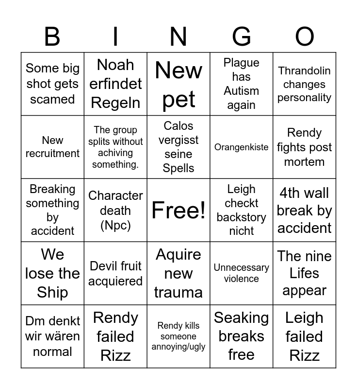 This bingo card has a free space and 24 words: Dm denkt wir wären normal, Devil fruit acquiered, Calos vergisst seine Spells, Seaking breaks free, Thrandolin changes personality, Some big shot gets scamed, Noah erfindet Regeln, New pet, Leigh checkt backstory nicht, 4th wall break by accident, Breaking something by accident, The group splits without achiving something., Unnecessary violence, The nine Lifes appear, New recruitment, Rendy failed Rizz, Rendy kills someone annoying/ugly, Plague has Autism again, Rendy fights post mortem, We lose the Ship, Character death (Npc), Aquire new trauma, Orangenkiste and Leigh failed Rizz.
