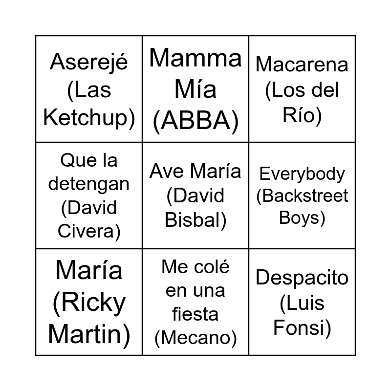 This bingo card has 21 words: Mi gran noche (Raphael), Despechá (Rosalía), Mamma Mía (ABBA), Loba (Shakira), La Reina (Lola Índigo), María (Ricky Martin), Aserejé (Las Ketchup), Macarena (Los del Río), Por la raja de tu falda (Estopa), Me colé en una fiesta (Mecano), Despacito (Luis Fonsi), Que la detengan (David Civera), Thriller (Michael Jackson), Don't stop me now (Queen), Everybody (Backstreet Boys), La Bomba (King África), Mayonesa (Chocolate), A quién le importa (Alaska), Ave María (David Bisbal), Besos (El canto del loco) and Carolina (M-Clan).