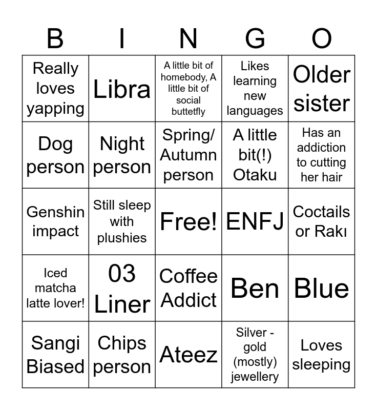 This bingo card has a free space and 25 words: 03 Liner, Ateez, Spring/ Autumn person, Sangi Biased, Older sister, Really loves yapping, Dog person, Libra, ENFJ, Coffee Addict, A little bit(!) Otaku, Genshin impact, Ben, Blue, Night person, Sensitive-harted (wanna be kind all time), Coctails or Rakı, A little bit of homebody, A little bit of social buttetfly, Has an addiction to cutting her hair, Still sleep with plushies, Loves sleeping, Chips person, Iced matcha latte lover!, Likes learning new languages and Silver - gold (mostly) jewellery.