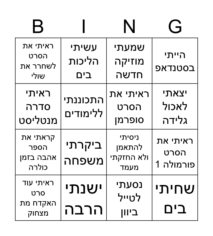 This bingo card has 16 words: ישנתי הרבה, ראיתי את הסרט פורמולה 1, שמעתי מוזיקה חדשה, ראיתי את הסרט לשחרר את שולי, קראתי את הספר אהבה בזמן כולרה, עשיתי הליכות בים, ניסיתי להתאמן ולא החזקתי מעמד, נסעתי לטייל ביוון, ראיתי סדרה מנטליסט, התכוננתי ללימודים, ראיתי עוד סרט האקדח מת מצחוק, הייתי בסטנדאפ, ביקרתי משפחה, יצאתי לאכול גלידה, ראיתי את הסרט סופרמן and שחיתי בים.
