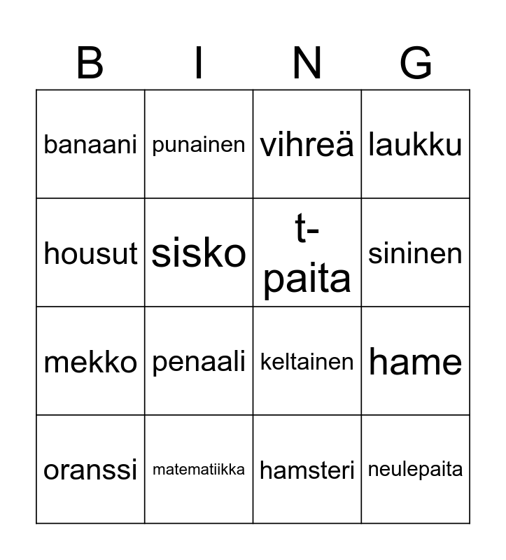 This bingo card has 25 words: omena, veli, sininen, kissa, housut, banaani, sisko, punainen, matematiikka, koira, mekko, keltainen, isä, kuulakärkikynä, t-paita, äiti, hamsteri, vihreä, penaali, hame, oranssi, apina, neulepaita, laukku and musiikki.
