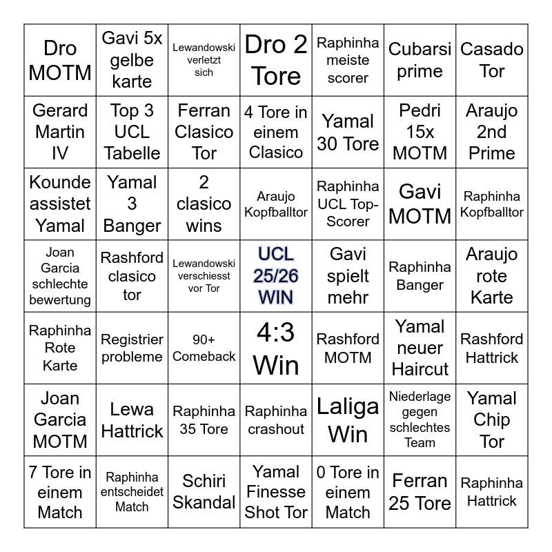 This bingo card has a free space and 48 words: Laliga Win, Pedri 15x MOTM, Yamal Finesse Shot Tor, Rashford clasico tor, 2 clasico wins, Araujo rote Karte, Gavi 5x gelbe karte, Raphinha entscheidet Match, Cubarsi prime, 4:3 Win, Casado Tor, Dro 2 Tore, Gavi MOTM, Raphinha UCL Top-Scorer, Joan Garcia MOTM, Raphinha Banger, Gerard Martin IV, Araujo 2nd Prime, Niederlage gegen schlechtes Team, Raphinha meiste scorer, Yamal 30 Tore, Lewandowski verschiesst vor Tor, Dro MOTM, Top 3 UCL Tabelle, Yamal Chip Tor, Ferran Clasico Tor, Raphinha Kopfballtor, 7 Tore in einem Match, Araujo Kopfballtor, Yamal 3 Banger, Ferran 25 Tore, Gavi spielt mehr, Rashford Hattrick, Lewa Hattrick, Joan Garcia schlechte bewertung, Rashford MOTM, Yamal neuer Haircut, Kounde assistet Yamal, 90+ Comeback, Raphinha 35 Tore, Raphinha Rote Karte, Raphinha Hattrick, Lewandowski verletzt sich, Schiri Skandal, 4 Tore in einem Clasico, Raphinha crashout, Registrier probleme and 0 Tore in einem Match.