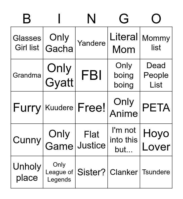 This bingo card has a free space and 24 words: Only Game, Only League of Legends, FBI, Unholy place, Mommy list, Glasses Girl list, Grandma, Only Gacha, Only Anime, Flat Justice, Only boing boing, Furry, I'm not into this but..., Hoyo Lover, Only Gyatt, Clanker, PETA, Yandere, Dead People List, Kuudere, Tsundere, Cunny, Literal Mom and Sister?.